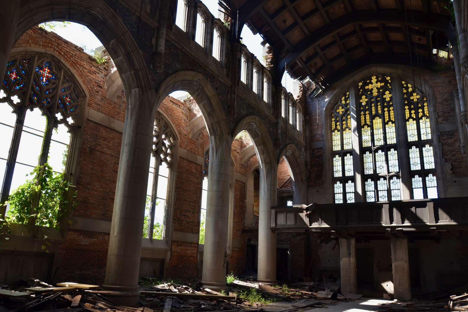 Those who stumble upon Pilsen’s landmark Zion Evangelical Lutheran Church, with its striking 90-foot-tall belltower and weathered Chicago brick exterior, might think their eyes are playing tricks on them. Because while the facade stands as tall and as proud as the day it was erected in 1880, the rest of the church lies in sparse ruins behind it, much like the movie set version of an old Western town. The once-bustling German sanctuary went into disrepair 1956 as the neighborhood’s racial and ethnic demographics were shifting, only to suffer a crippling fire in 1979 which destroyed the structure’s roof and most of its interior furnishings. Then, in 1998, a windstorm flattened what was left of the church’s walls, leaving just the front-facing belltower, arching doors, and a few other pieces of supporting rubble intact. Hearing of the storm, descendents of former congregation members flocked to the site, bringing with them documentation detailing the church’s prominent place in local history. This was enough to sway the building’s new owner, who fixed up the few features that remained, installed a new skylight in the soaring belltower, and stabilized the foundation before transforming the whole shebang into a serene garden complete with the original charred crucifix protected behind plastic casing.