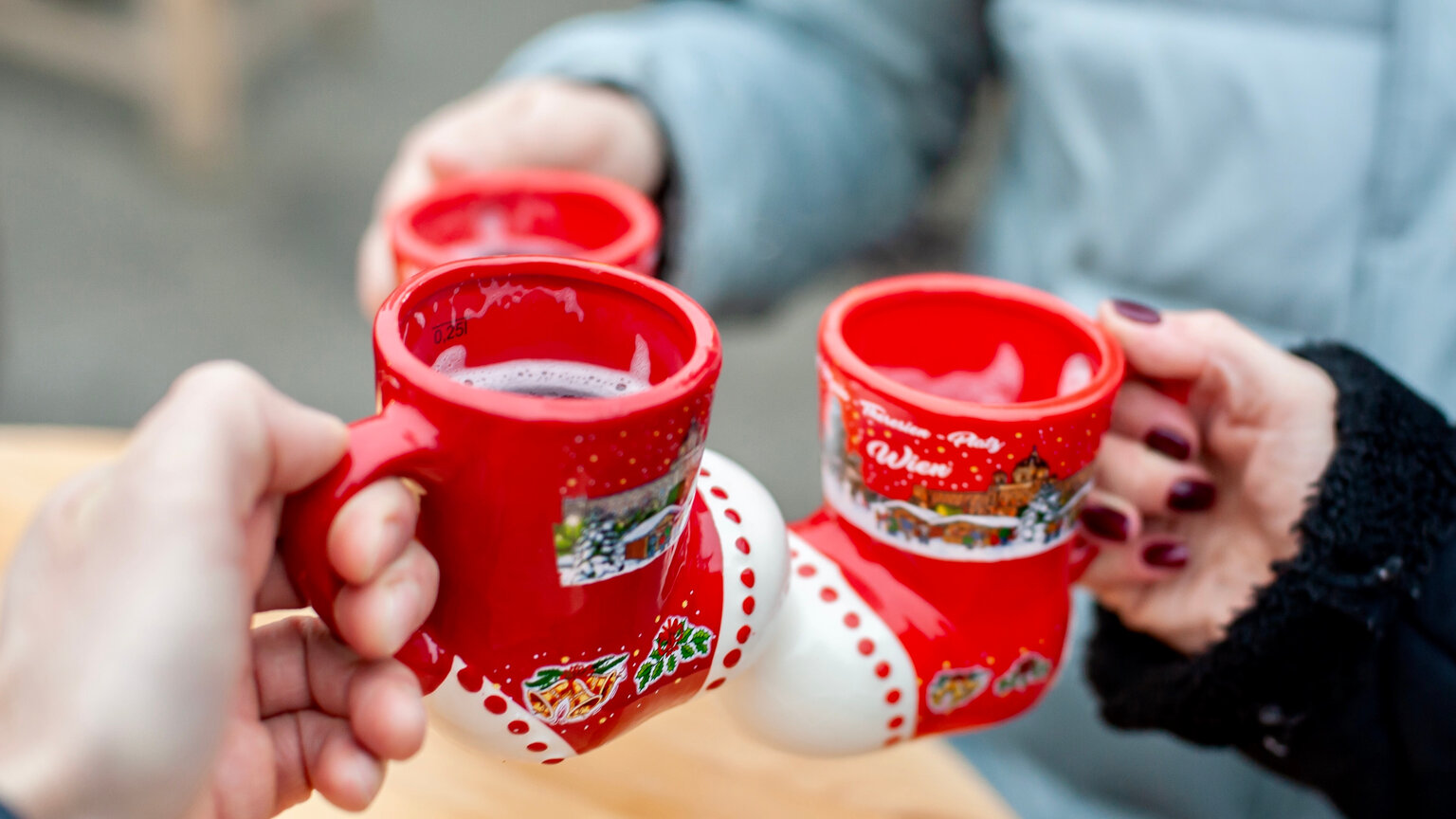 Why? Because my glühwein vendor was about to pour my spiced warm wine into a regular cup. Everywhere I looked patrons young and old (well, young-ish—the drinking age is 18 in Vienna) clutched adorable porcelain mugs shaped like little red boots, illustrated with the Weihnachtsdorf. They inhaled its cozy contents deeply, letting it fog up their glasses before sipping. But the glühwein gods have forsaken me. I was going to be forced to drink from a boring, typical, cup.