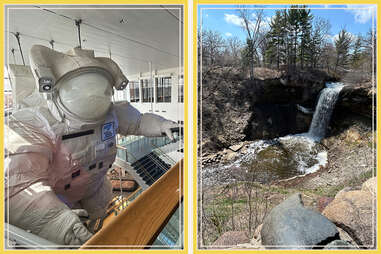 - Next, aid your digestion with a trek to St. Anthony Falls, the only natural waterfall on the Mississippi River, near the University of Minnesota campus and gently framed by the skyline. Or, you could venture a 15-minute drive out to the Minnehaha Falls—stark and serene, cascading over limestone, with sweeping trails and beavers buggering about. Vast green expanses might inspire exercise, endless stone step-climbing, and the classic parental game of pretending to throw kids over waterfalls. Fatigue warrants snacks, in which case, seek out Sea Salt’s seafood baskets and tacos. Or grab grub before leaving town at Afro Deli, a popular St. Paul counter-service stop offering Somali steak sandwiches and spicy beef sambusas with creole sauce—a savory memento for the trek back home.