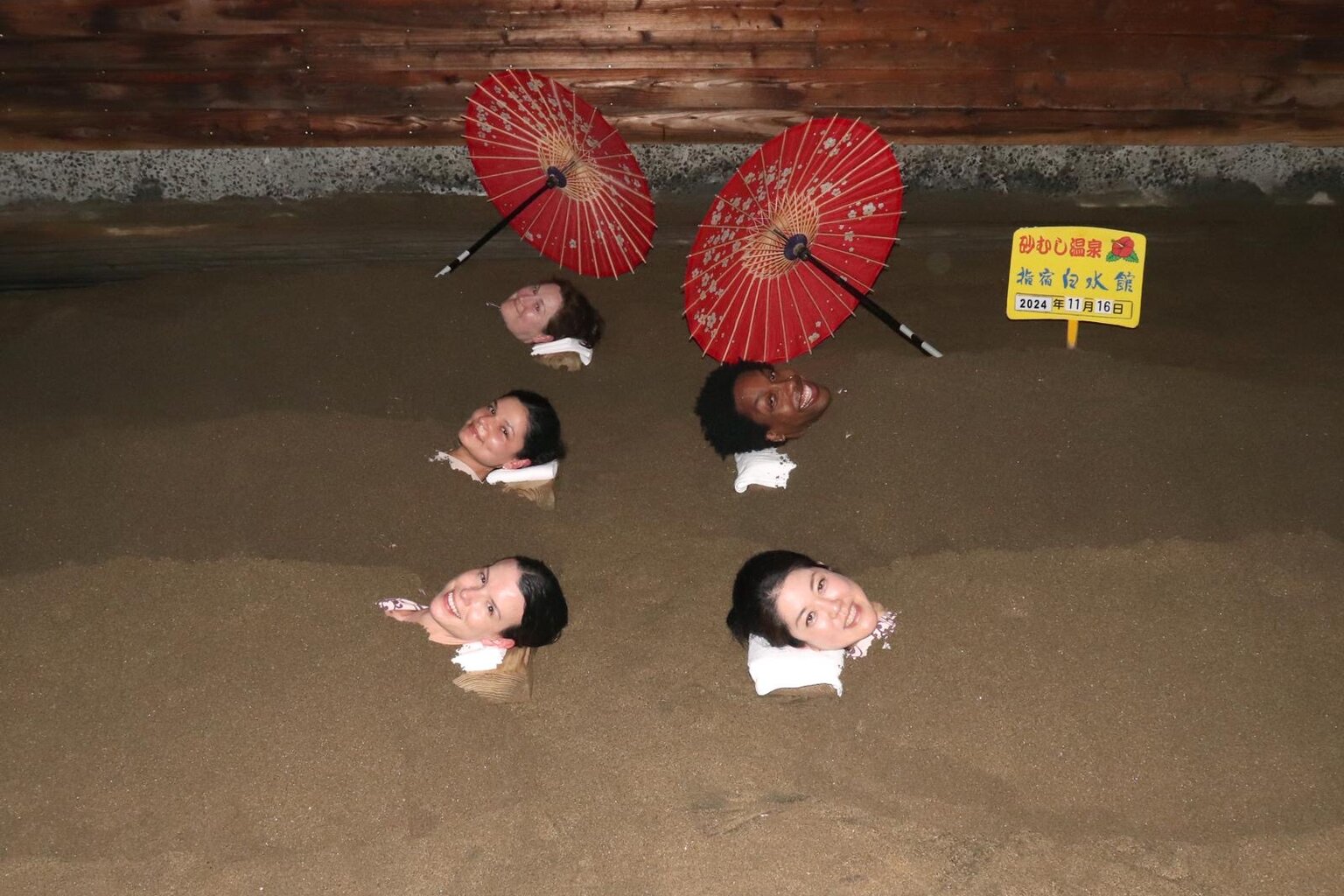 The photographer stuck some red umbrellas into the sand for decoration, asked us to turn our heads, then snapped a picture. We were told that the longest we should stay buried is 15 minutes—any more than that and you run the risk of overheating. I was staring straight up at an analog clock, as some traditional Japanese music played faintly in the background. We must’ve been facing the ocean, but I couldn’t quite tell, as it was already dark out. My mind became restless, wondering if, somehow, this experience would cure my traveler’s constipation (it didn’t).