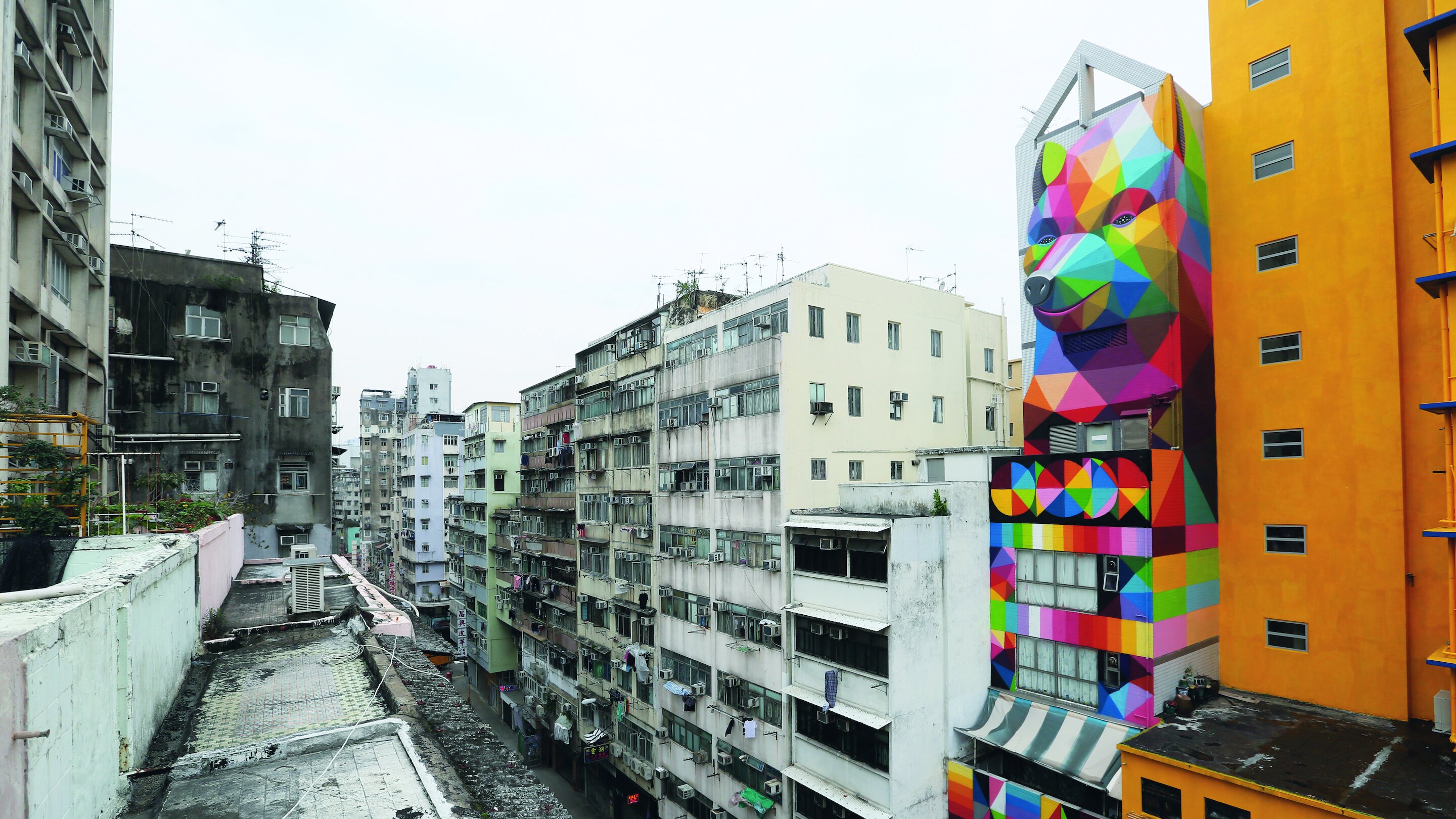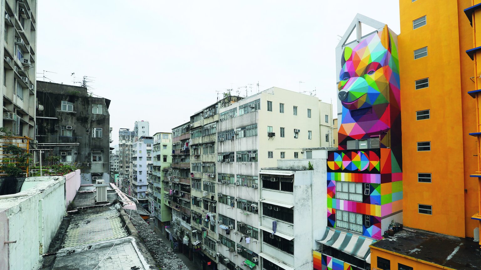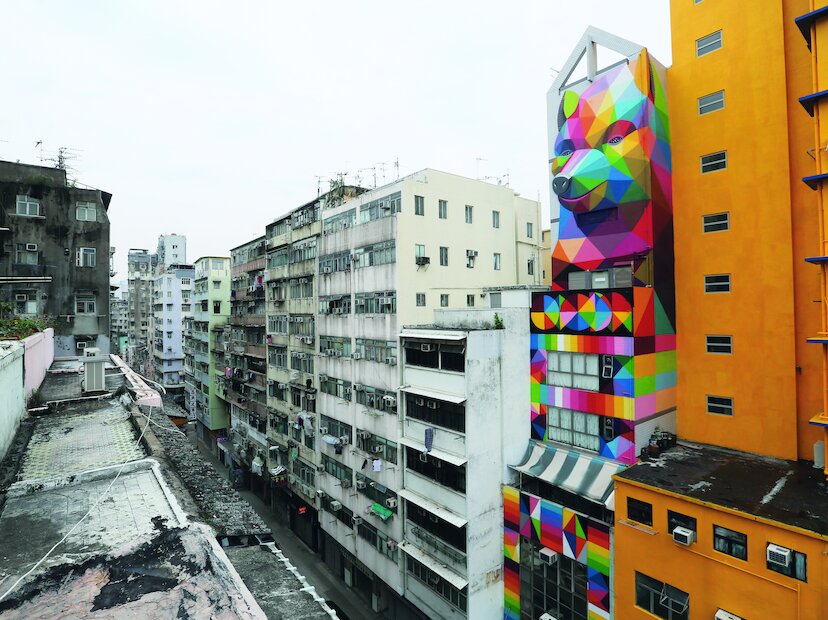 This is a great example of how street art can add to an environment. There was never much public art in Hong Kong, and now they have this great mural festival. Okuda’s work is all like this, geometric, colorful stuff using three dimensions. It stands out as a great example of how street art can brighten up an environment, especially in a place that’s not used to it.