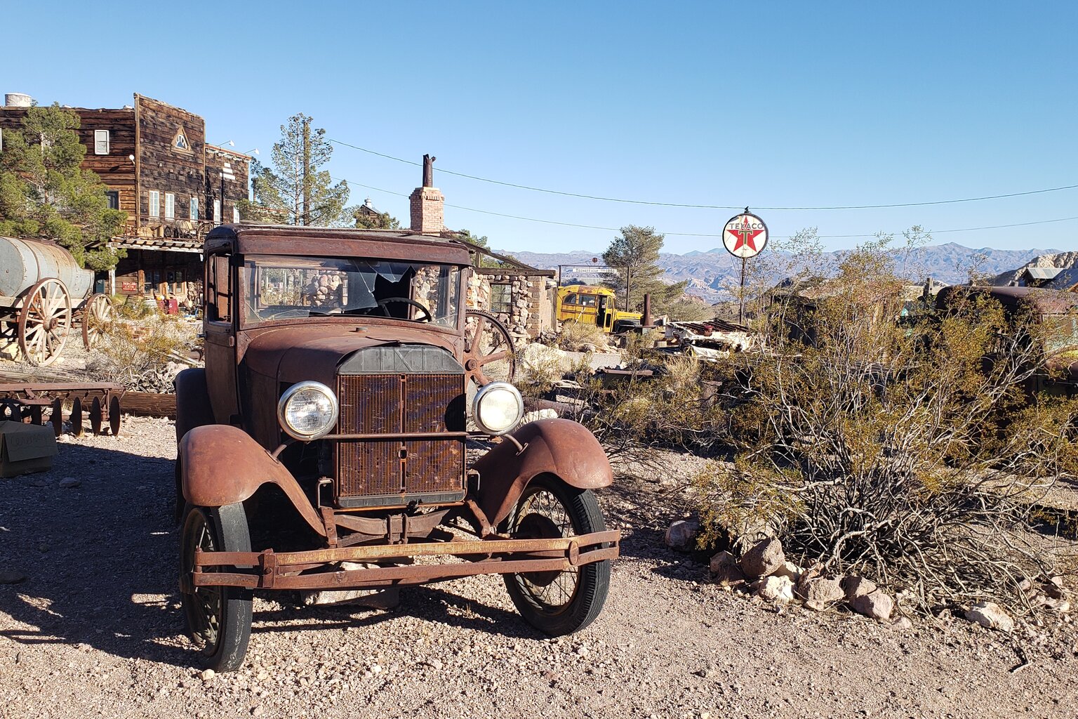 It's an oddly beautiful collection of vintage signs, cars, gasoline pumps, and other slices of Americana that blend cowboy culture with the road trip boom of the mid-1900s. The main office, which includes a snack counter and gift shop, was originally a dining and recreation hall for the miners with wood ovens in the kitchen. The oldest building, a holdover from the 1880s, was burned down. Sad to say, vandalism is an issue. It's a problem that comes with being a photogenic location in the middle of the desert.