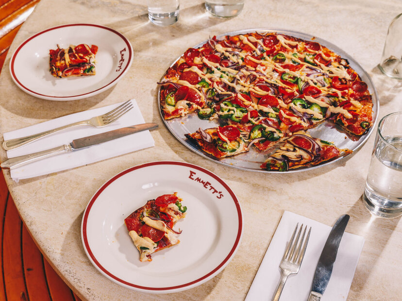 In a city teeming with paper-thin slices designed to fold in half, Emmett’s is a welcome addition. After spending his college years longing for the pizza he grew up with in Chicago, Emmett Burke opened his namesake restaurant in SoHo in 2013 and it quickly became a destination for deep dish pizza. With his latest venture, Emmett’s on Grove, Burke is bringing midwest supper club vibes and a lesser-known Chicago-style pie to NYC. The spot specializes in the Tavern Style Pizza, an ultra-thin, crispy round pie that’s cut up into squares and in options like the Peggy O’ with grana padano or the Sausage Oregano with ground spicy Italian sausage. It’s the complete opposite of the fork-and knife-required pies that most associate with Chicago, and it’s worth a try for New Yorkers looking for a cheesy bite you can’t find at the slice shop.