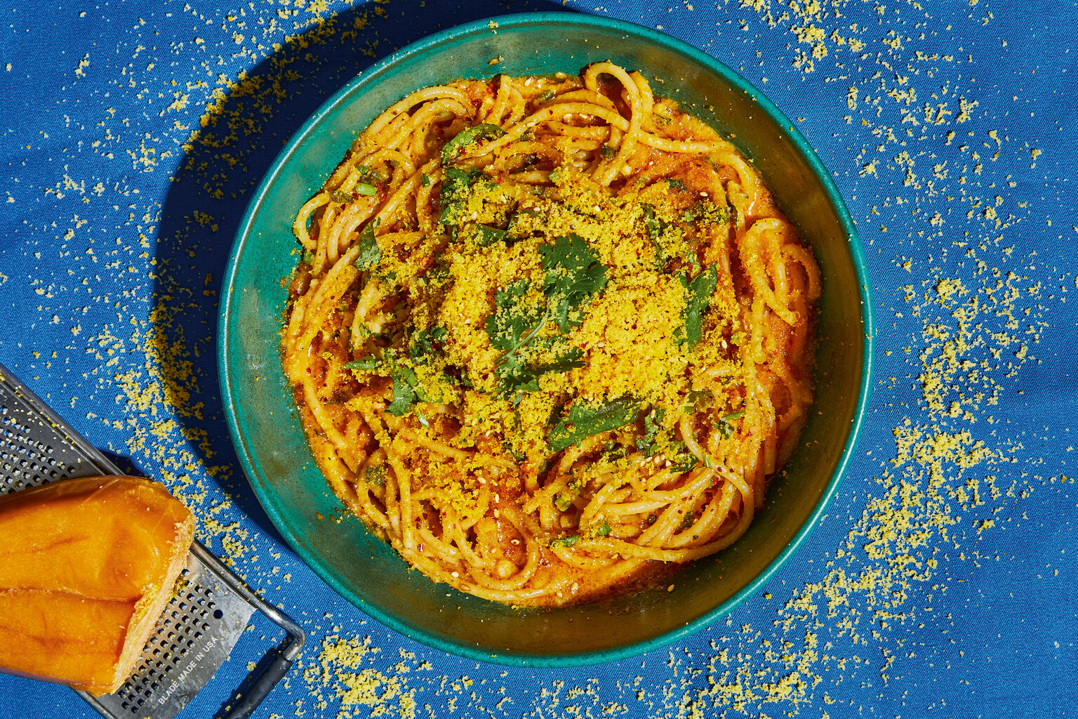 3. Add the slightly undercooked pasta, the butter cubes, and half the grated wuyuzi. Turn the heat back on to medium and toss with tongs to mix thoroughly. Cook for 1 to 2 minutes, stirring occasionally, until the noodles are cooked to al dente and the sauce has thickened and turned milky rather than translucent. Taste for seasoning and add salt, if desired. Transfer the pasta to four serving dishes. Garnish each serving with handfuls of the basil and shiso, then top with the remaining grated wuyuzi. Finish with the chile flakes and/or sesame seeds, if using, and serve immediately.